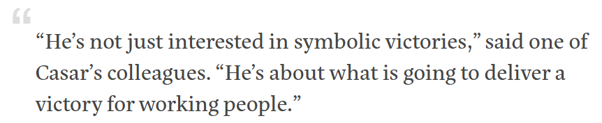 Its a whole lot better than sitting in a committee hearing. He believed his presence, as the second-highest ranking Democrat on the House Education and Workforce Committee, could make a difference in the unionization fight. But secondarily, he considered it a way to stay grounded, outside the trappings of power and in solidarity with the kind of people who brought him to Washington. We need more congressmen and -women, Casar told me, who feel more comfortable marching into a fancy D.C. restaurant with a union than mingling inside of one with lobbyists.