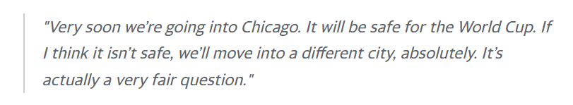 "Very soon were going into Chicago. It will be safe for the World Cup. If I think it isnt safe, well move into a different city, absolutely. Its actually a very fair question."