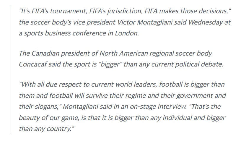 When discussing those remarks FIFA vice president Victor Montagliani put an end to the notion that Trump could dictate where matches are held. He said on Wednesday: