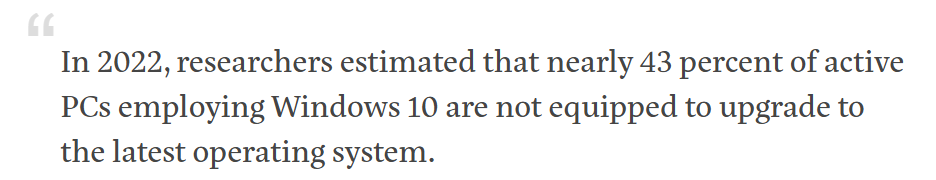 For everyone who cant afford those choices, they can run Windows 10 without support, making their devices easier to hack. The sheer scale of what will happen when support ends on October 14 is alarming, Nathan Proctor, senior director the U.S. Public Interest Research Group (PIRG) Right to Repair campaign, told the Prospect. He noted that when Microsoft ended support for Windows 8 in January 2016, less than 4 percent of users were still running it. But about 42 percent of Windows computers worldwide are still using Windows 10.