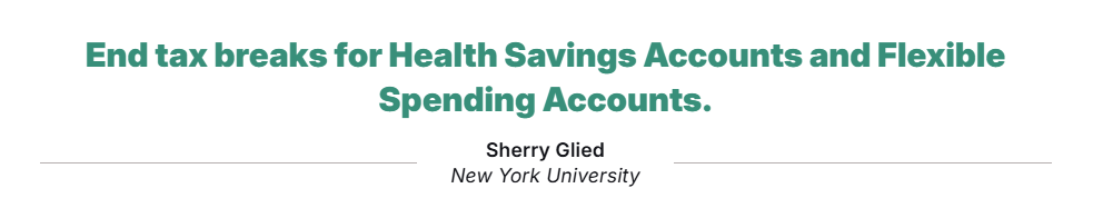 Nearly one-quarter of Americans with private health insurance get an extra break on their health spending by holding a tax-favored savings account, generally a Health Savings Account or Flexible Spending Account. These tax breaks are inequitable and inefficient, and their knock-on effects inhibit the effective functioning of a competitive health care market. Get rid of them! Benefits from savings accounts are greatest for people in high marginal tax brackets who have ample funds to set aside for future expenses. They do nothing to make care more affordable for most Americans. These breaks turn the logic of insurance design encouraging people to be deliberate in the initiation of care while protecting them against high expenses upside down. Instead of protecting people from high costs, they offer discounts on the first dollar of care and for entirely discretionary purchases such as eyeglasses, vitamins, and, most recently, fancy treadmills and Oura Rings. In doing so, they drive up insurance premiums. Finally, these accounts subsidize the provision of medical services outside insurance networks. Because plans representing millions of members are far more effective negotiators than individuals, subsidizing that care undermines price discipline across the market.
