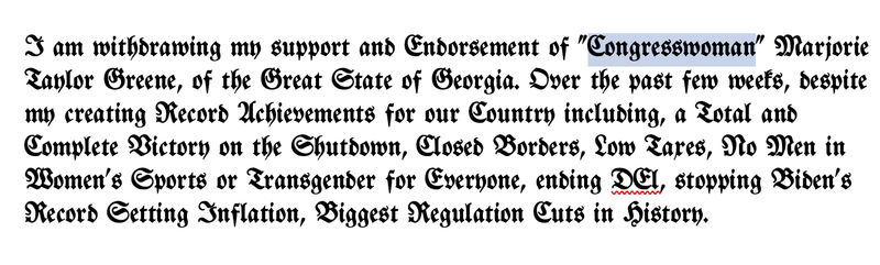 "I am withdrawing my support and Endorsement of "Congresswoman" Marjorie Taylor Greene, of the Great State of Georgia. Over the past few weeks, despite my creating Record Achievements for our Country including, a Total and Complete Victory on the Shutdown, Closed Borders, Low Taxes, No Men in Women's Sports or Transgender for Everyone, ending DEl, stopping Biden's Record Setting Inflation, Biggest Regulation Cuts in History, stopping EIGHT WARS, rebuilding our Military, being RESPECTED by every Country in the World (as opposed to being the laughingstock that we were just 12 months ago!), having Trillions of Dollars (Record Setting!) INVESTED in the U.S.A., and having created the "HOTTEST" Country anywhere in the World from being a DEAD Country just 12 months ago (and so much more!), all I see "Wacky" Marjorie do is COMPLAIN, COMPLAIN, COMPLAIN! It seemed to all begin when I sent her a Poll stating that she should not run for Senator, or Governor, she was at 12%, and didn't have a chance (unless, of course, she had my Endorsement which she wasn't about to get!). She has told many people that she is upset that I don't return her phone calls anymore, but with 219 Congressmen/women, 53 U.S. Senators, 24 Cabinet Members, almost 200 Countries, and an otherwise normal life to lead, I can't take a ranting Lunatic's call every day. I understand that wonderful, Conservative people are thinking about primarying Marjorie in her District of Georgia, that they too are fed up with her and her antics and, if the right person runs, they will have my Complete and Unyielding Support. She has gone Far Left, even doing The View, with their Low IQ Republican hating Anchors. Thank you for your attention to this matter. MAKE AMERICA GREAT