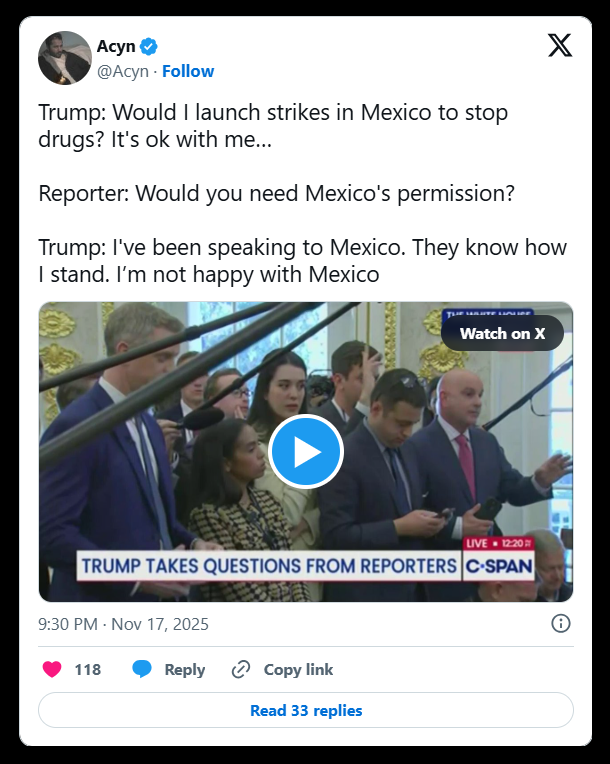 The Trump administration has bombed dozens of boats south of the United States without providing evidence that they are trafficking drugs, or providing the names of people killed in the strikes. In some cases, the dead and injured were fishermen whom the U.S. declined to prosecute. The strikes have been condemned by multiple countries, with some even opting to stop sharing drug-trafficking intelligence with the U.S. out of fear that it would be used for more bombings without transparency. Even Republicans have spoken out against the strikes. But if Trump decides to strike Mexico, that could change, as some Republicans have been egging on the president to bomb the country for years.