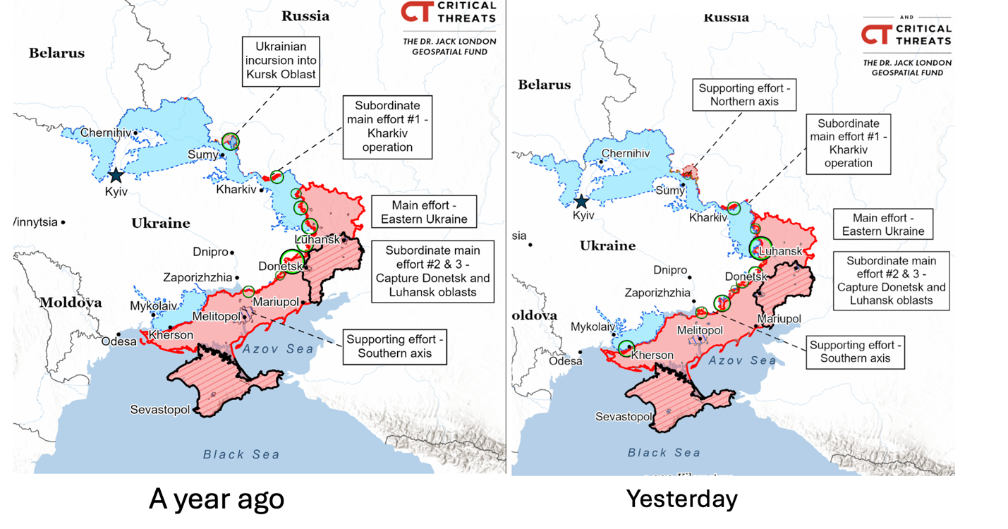 First, about the military situation. The maps at the top of this post show how the area of Ukraine under Russian control -- shaded pink -- has changed over the past year. You may ask, what change? Exactly. The Ukraine war isn't like World War II, in which breakthroughs could be exploited by armored columns sweeping into the enemy's rear. It's a war in which the battlefield is swarming with drones, where there isn't even a well-defined front line, and the "kill zone" within which even armored vehicles are basically death traps is many kilometers wide.