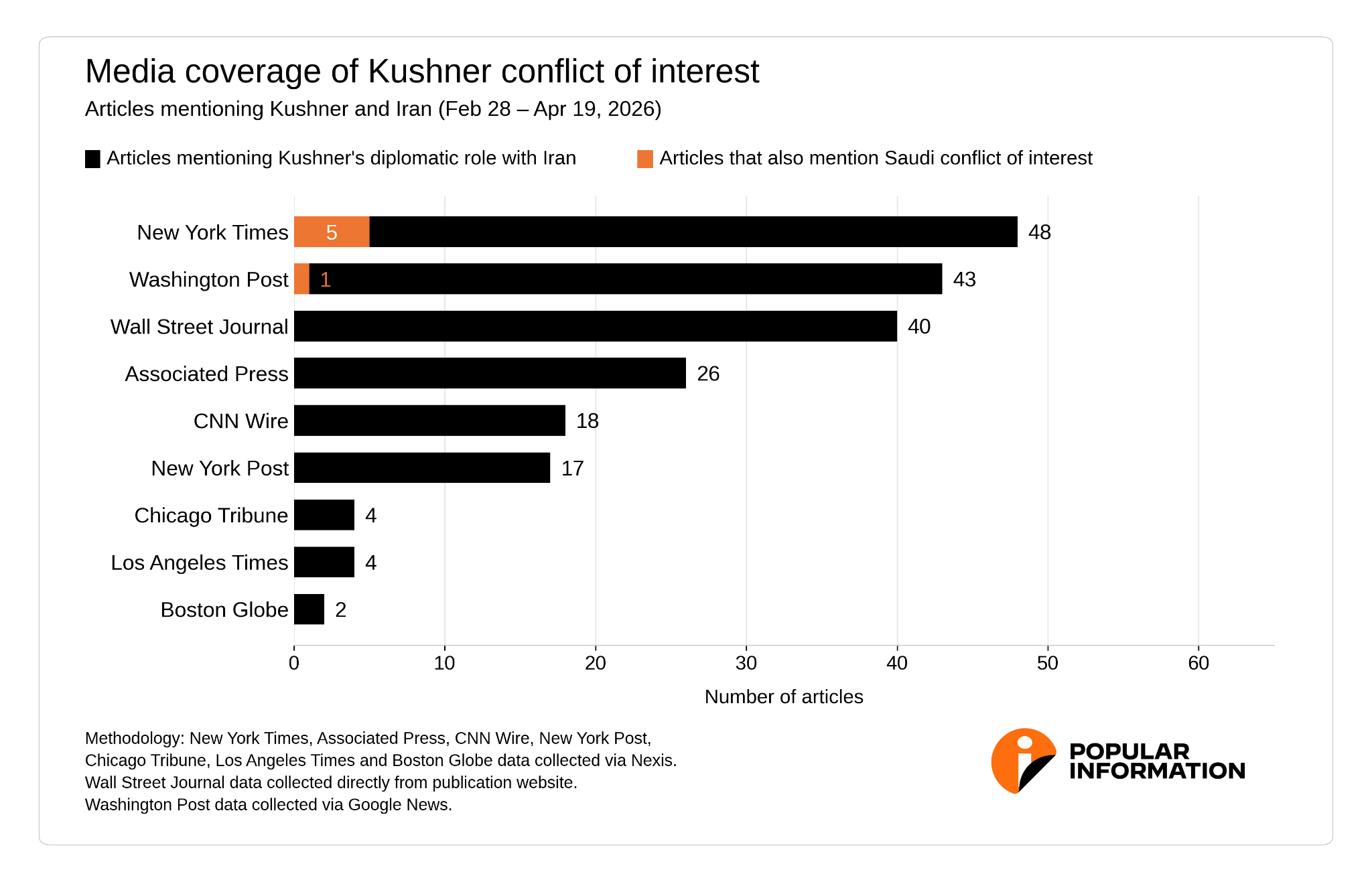 Popular Information analyzed coverage of Kushner's diplomatic role from the outset of the war with Iran on February 28 to April 19. During that period, 202 articles mentioning Kushner's role representing the U.S. in negotiations with Iran were collectively published by The New York Times, The Washington Post, The Wall Street Journal, The Associated Press, CNN Wire, The New York Post, The Chicago Tribune, The Boston Globe, and The Los Angeles Times.