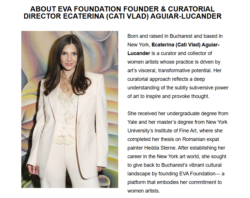 (Bucharest, Romania October 10, 2025) EVA Foundation, founded by curator and collector Ecaterina (Cati Vlad) Aguiar-Lucander, is pleased to announce its new home and collection will be free and open to the public by appointment beginning October 16, 2025. Marking the debut of the first foundation in Bucharest dedicated to women artists, this inaugural moment introduces the public to both its collection and its newly restored buildinga former 1930s townhouse whose transformation bridges the domestic and the institutional.