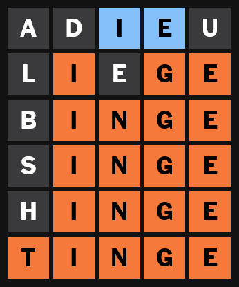 Had a 50/50 chance for a 2...tight or tinge, tinge or tight...but it was yesterday that was my lucky day, unrelated to Wordle.