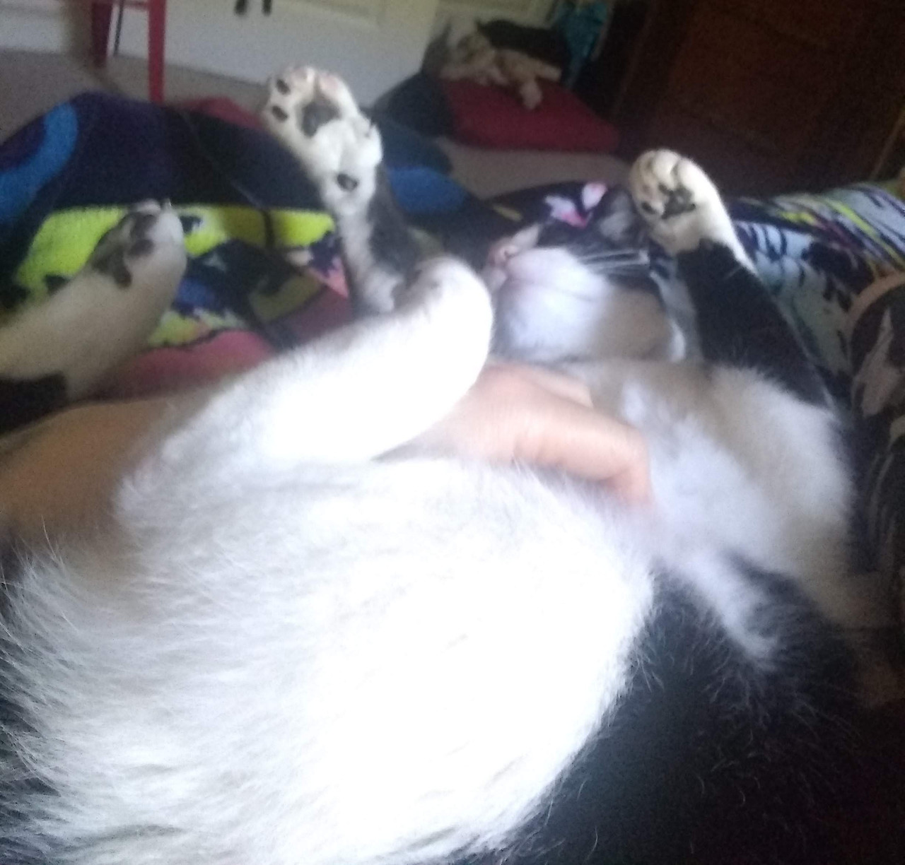 Long extended belly and chest rubs Im talking about 15 minutes . I tell him my arm is tired I move it away he lays there wondering if I am done or not then he gets up and lays on my belly purrin. As I bite my lip when he kneads me. I love him so much.