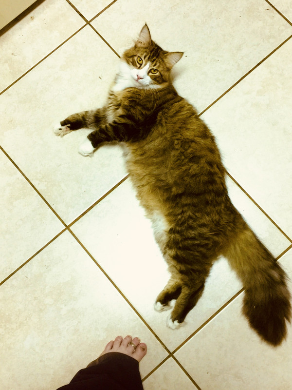 We later got him a little sister, a tortie who topped out under 5 pounds. He's the most loving brother youve ever seen. His paws are like giant catchers mitts and he just holds them out and lets Pixie pounce all over him and he just rolls back and lets her get it out of her system, and then they curl up together. Such a mellow dude.