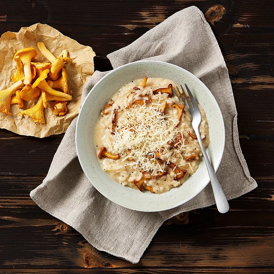 A creamy chanterelle risotto with white wine, chanterelles and grated parmesan. Enhance the mushroom flavor with mushroom broth. The chanterelle risotto is perfect as an accompaniment to, among other things, game dishes, with a salad or just to eat as it is.