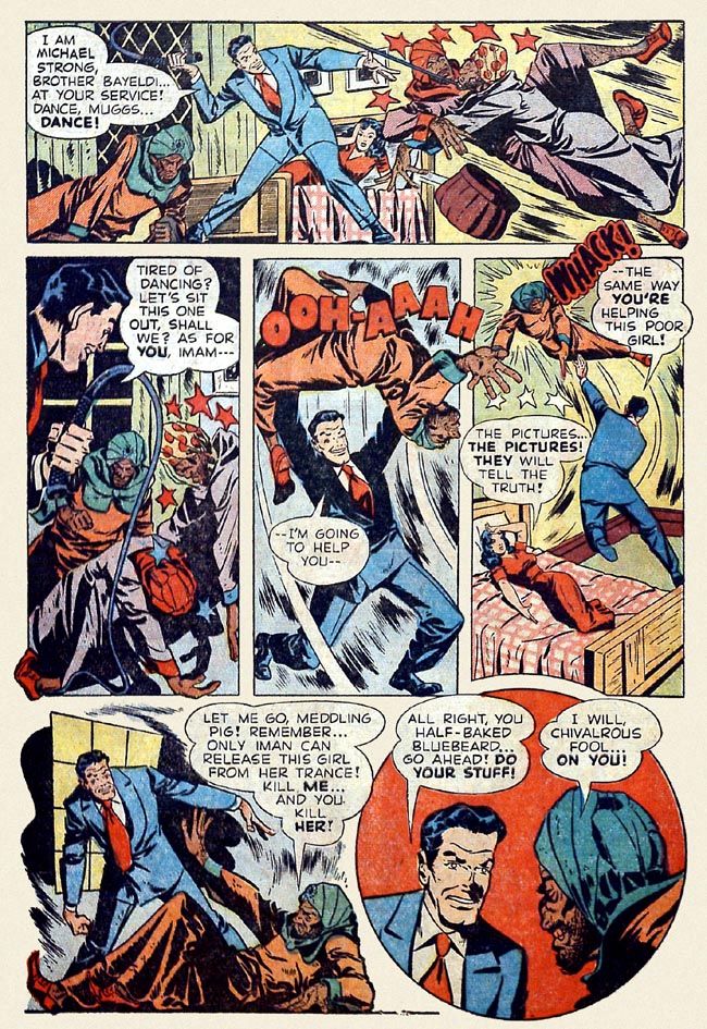 As RITC reaches the milestone of 50 posts, I present to you this delightful tale from Police Lineup #2, cover dated December 1951. Normally, I wouldn't feature a tale like this because there is no real religion presented here. Just a stereotype that wrongly associates Islam with human sacrifice. I'm not aware of that being present in the Quran. You have to go to the Old Testament for that kind of God sanctioned horror.