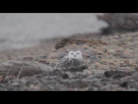 Snowy Owl rests in driftwood on the shore of Whitefish Point